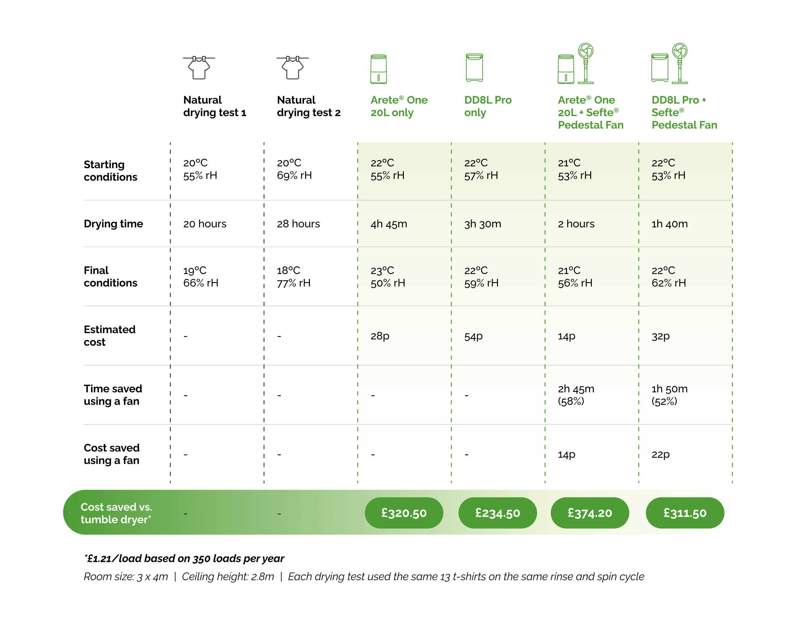 Based on this controlled test, the fastest way to dry your laundry is using a combination of the Meaco Arete® One 20L compressor dehumidifier and the Meaco Sefte® Pedestal fan.